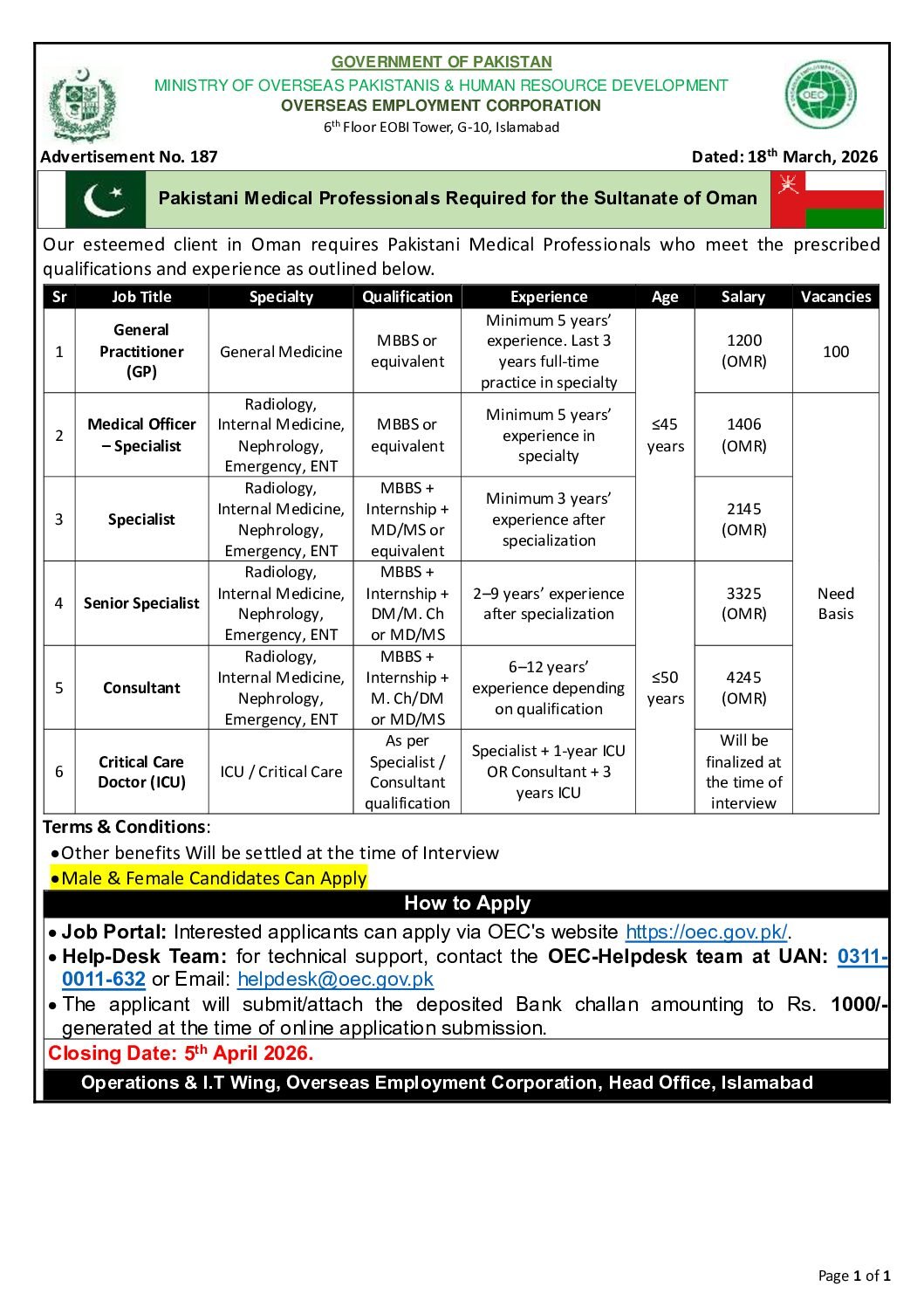 If you are searching for medical jobs in Oman for Pakistanis 2026, this is a great opportunity. The Overseas Employment Corporation (OEC) is offering jobs for medical professionals in Oman. These jobs are ideal for doctors, nurses, and healthcare staff who want to work abroad with high salary and free benefits.